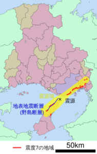 野島断層と兵庫県南部地震の震源域 画像引用元:ウィキペディア